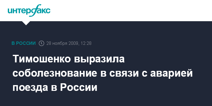 Москва. 28 ноября INTERFAX.RU - Премьер-министр Украины Юлия Тимошенко направила правительственную телеграмму главе правительства Российской Федерации Владимиру Путину в связи с аварией поезда Москва - Санкт-Петербург "Невской экспресс".