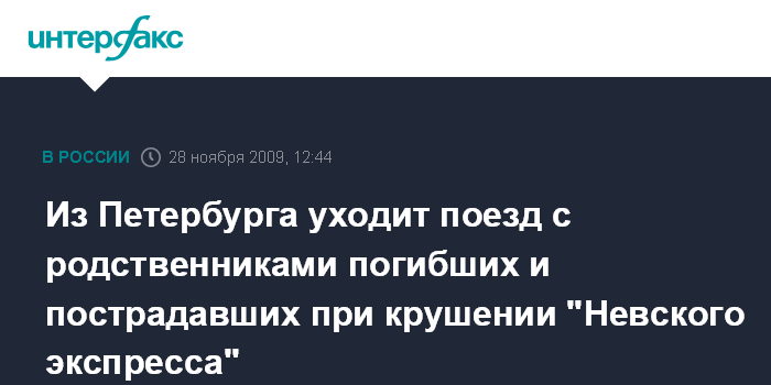 Москва. 28 ноября INTERFAX.RU - С Московского вокзала Петербурга уходит поезд с родственниками жертв и пострадавших при крушении "Невского экспресса" на границе Тверской и Новгородской областей, сообщили "Интерфаксу" в ГУ МЧС по Северной столице.