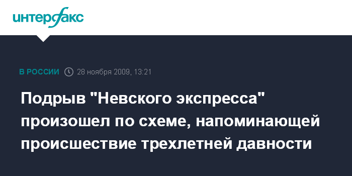 Москва. 28 ноября INTERFAX.RU - Характер взрыва на месте крушения "Невского экспресса", который произошел в пятницу вечером, напоминает аналогичный инцидент, который произошел три года назад, сообщил президент РЖД Владимир Якунин в ходе видеоконференции с оперативным штабом по ликвидации последствий аварии.