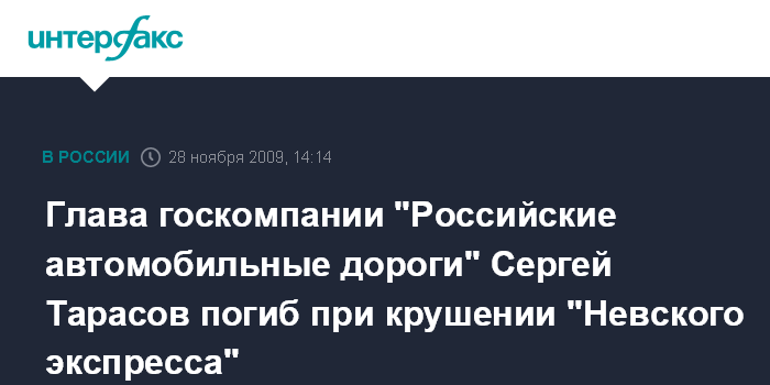 Москва. 28 ноября INTERFAX.RU - Бывший сенатор от Петербурга, в последнее время работавший главой госкомпании "Российские автомобильные дороги", Сергей Тарасов, по предварительным данным, погиб при крушении "Невского экспресса" в Тверской области, сообщил "Интерфаксу" информированный источник в северной столице.