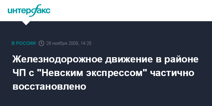 Москва. 28 ноября INTERFAX.RU - В районе катастрофы "Невского Экспресса" в 13:31 мск открыто движение по нечетному пути, сообщает программа "Вести" телеканала "Россия" со ссылкой на ОАО "РЖД".