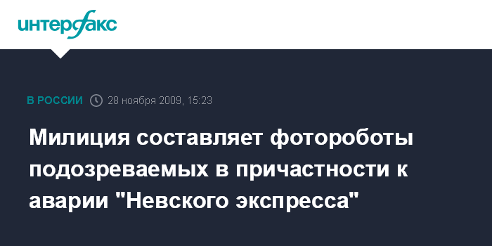 Москва. 28 ноября INTERFAX.RU - Сотрудники милиции составляют фотороботы подозреваемых в причастности к аварии поезда "Невский экспресс", сообщил "Интерфаксу" источник в правоохранительных органах.
