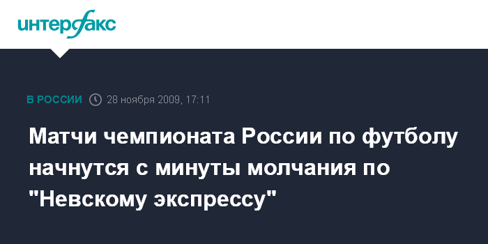 Москва. 28 ноября INTERFAX.RU - Матчи 30-го тура чемпионата России по футболу начнутся с минуты молчания в память о погибших при крушении поезда "Невский экспресс". Об этом сообщает официальный сайт Российской футбольной премьер-лиги(РФПЛ).
