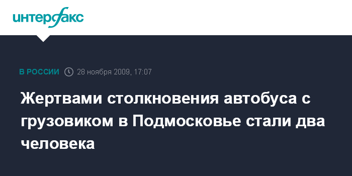 Москва. 28 ноября INTERFAX.RU - В Подмосковье в результате столкновения рейсового автобуса и автофуры погибли два человека, сообщил "Интерфаксу" в субботу источник в правоохранительных органах.