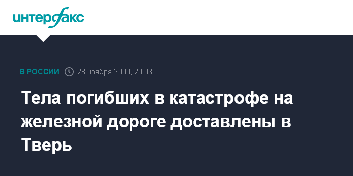 Тверь/Москва. 28 ноября. INTERFAX.RU - Тела погибших в результате крушения "Невского экспресса" доставлены в Тверь, передает корреспондент "Интерфакса".