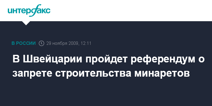 Лондон. 29 ноября. INTERFAX.RU - В Швейцарии в воскресенье состоится референдум по вопросу о запрете на строительство минаретов в стране, сообщает Би-би-си. Предложение запретить строить башни, с которых мусульман созывают на молитву, выдвинуто ультраправой Народной партией, которая имеет крупнейшую фракцию в одной из палат швейцарского парламента. Партия считает, что минареты могут стать первым признаком исламизации Швейцарии.