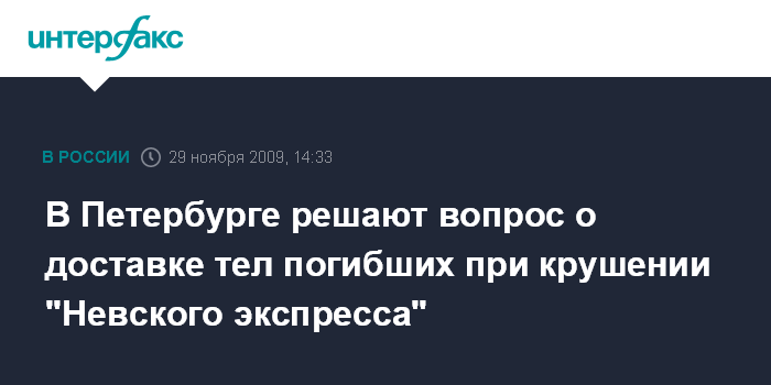Санкт-Петербург. 29 ноября. INTERFAX.RU - Тела петербуржцев, погибших при крушении "Невского экспресса", доставят в Петербург из Твери самолетом МЧС или авторефрижераторами. "Пока еще не принято решение, будет это борт МЧС или спецтранспорт - рефрижераторы, которые пойдут из Петербурга в Тверь, заберут груз 200 и вернутся", - сообщил "Интерфаксу" источник в МЧС города. До сих пор неизвестно точно, сколько жителей Петербурга погибли при аварии "Невского экспресса".