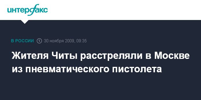 Москва. 30 ноября. INTERFAX.RU - На востоке столицы был обнаружен труп жителя Читы с пятью ранениями из пневматического пистолета, сообщил "Интерфаксу" в понедельник источник в правоохранительных органах города.