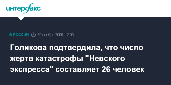 Москва. 30 ноября. INTERFAX.RU - Жертвами катастрофы поезда "Невский экспресс", по состоянию на понедельник, считаются 26 человек, сообщила глава Минздравсоцразвития Татьяна Голикова журналистам в Москве в понедельник.