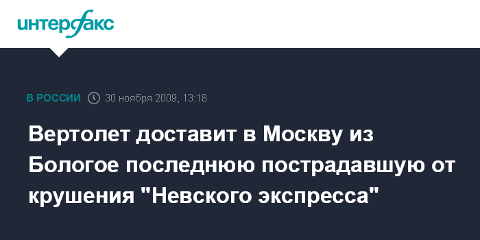 Вертолет доставит в Москву из Бологое последнюю пострадавшую от крушения "Невского экспресса"