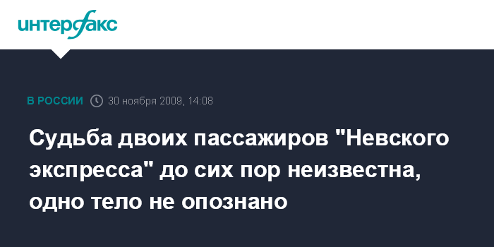 Москва. 30 ноября. INTERFAX.RU – По уточненным данным, после катастрофы поезда "Невский экспресс" остается неизвестной судьба двух его пассажиров, сообщили в понедельник "Интерфаксу" в управлении информации МЧС РФ.
