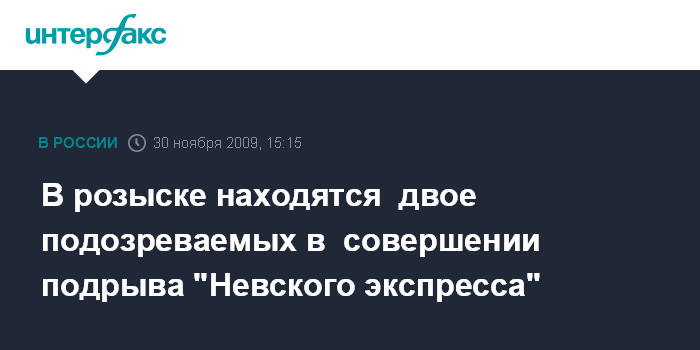 Москва. 30 ноября. INTERFAX.RU - Правоохранительные органы разыскивают двух подозреваемых в совершении подрыва поезда "Невский экспресс", сообщил "Интерфаксу" источник, знакомый с ходом расследования. По его словам, в настоящее время в розыске находятся двое подозреваемых в совершении этого преступления. На одного из разыскиваемых составлен фоторобот, на второго - словесный портрет.