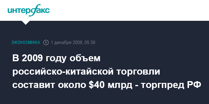 По итогам 10 месяцев 2009 года товарооборот между Россией и Китаем сократился по сравнению с тем же периодом 2008 года на 34,4% и составил $31,5 млрд.