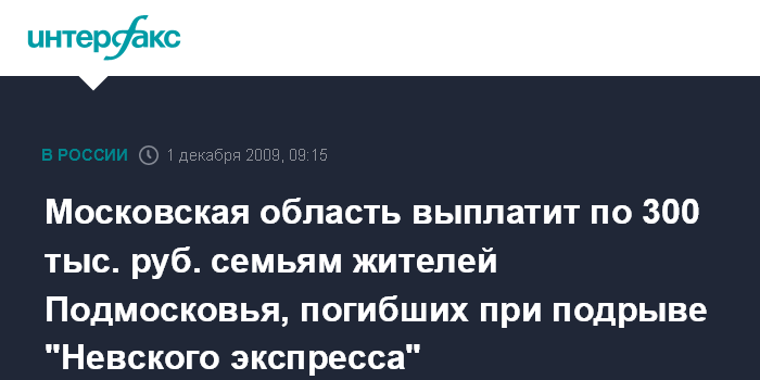 Московская область выплатит по 300 тыс. руб. семьям жителей Подмосковья, погибших при подрыве "Невского экспресса"