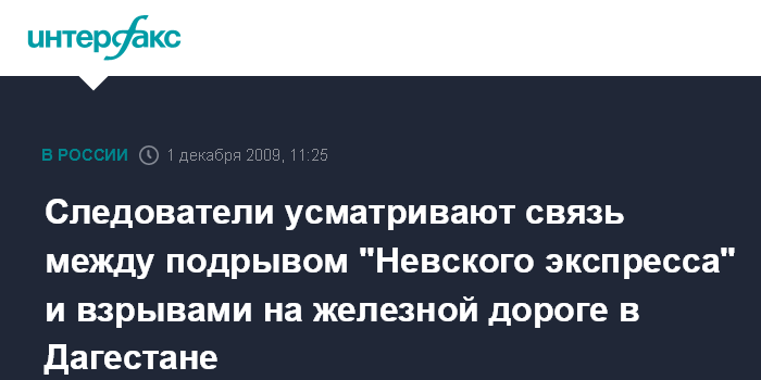 Москва. 1 декабря. INTERFAX.RU – Сотрудники Южного следственного управления на транспорте, занимающиеся расследованием взрывов на железной дороге в Дагестане, не исключают связь между этими происшествиями и подрывом "Невского экспресса".