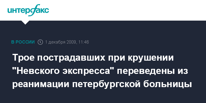 Москва. 1 декабря. INTERFAX.RU – В Петербурге врачи Дорожной клинической больницы и НИИ Скорой помощи им.Джанелидзе, принявших основной поток пострадавших с "Невского экспресса", пока не выписывают доставленных к ним больных.