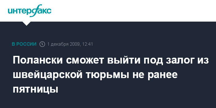 Решение о возможности освобождения Полански под залог в 4,5 млн швейцарских франков (около 130 млн рублей - ИФ)было принято федеральным уголовным судом Швейцарии 25 ноября. "Суд полагает, что представленный залог, вместе с другими мерами, такими как удержание его личных документов, электронный контроль за местом его жительства, может стать подходящим для того, чтобы избежать риска побега", - говорится в постановлении суда.