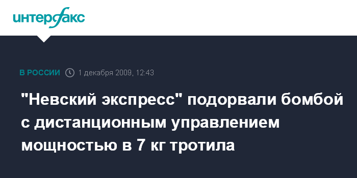 Москва. 1 декабря. INTERFAX.RU - На месте крушения поезда "Невский экспресс" сработало самодельное взрывное устройство с дистанционным управлением, сообщил "Интерфаксу" официальный представитель СКП РФ Владимир Маркин. "По предварительной информации, под локомотивом "Невского экспресса" сработало самодельное взрывное устройство с дистанционным управлением примерной мощностью, эквивалентной 7 кг тротила", - отметил Маркин.