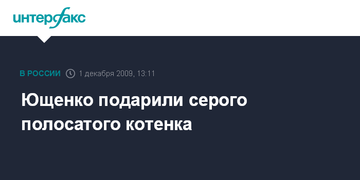 Москва. 1 декабря. INTERFAX.RU - Президенту Украины Виктору Ющенко подарили котенка. Как передает корреспондент агентства "Интерфакс-Украина", по окончанию торжественных мероприятий по случаю 18-й годовщины всеукраинского референдума, подтвердившего Акт независимости Украины, журналист канала СТБ Осман Пашаев подарил президенту серого полосатого котенка.
