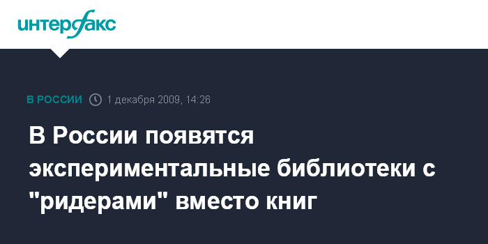 "Техническая революция заставляет нас переходить на новые технологии библиотечного дела. Это новые носители, мы сейчас будем делать несколько экспериментальных библиотек, где будут использованы так называемые "ридеры",- сказал Авдеев на Всероссийском конгрессе соотечественников во вторник в Москве.