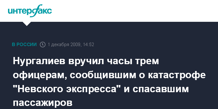 Москва. 1 декабря. INTERFAX.RU – Глава МВД России Рашид Нургалиев вручил во вторник часы сотрудникам МВД, которые ехали в потерпевшем крушение "Невском экспрессе" и помогли спасти многих людей.