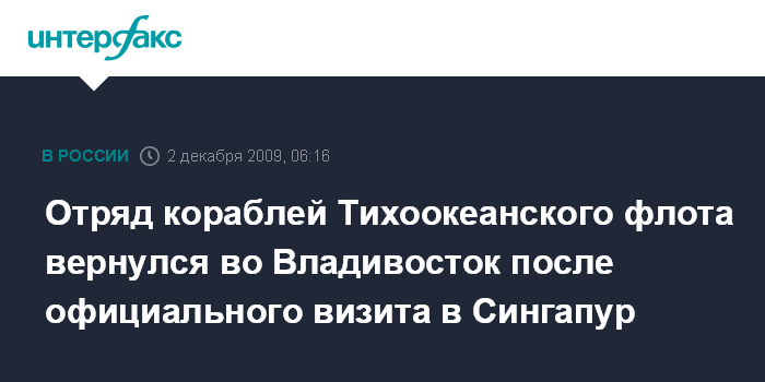 Владивосток. 2 декабря. ИНТЕРФАКС-ДАЛЬНИЙ ВОСТОК - Отряд кораблей Тихоокеанского флота (ТОФ) в составе гвардейского ракетного крейсера "Варяг", спасательного буксира "Фотий Крылов" и морского танкера "Печенга" после завершения официального визита в Сингапур вернулся к родным берегам.