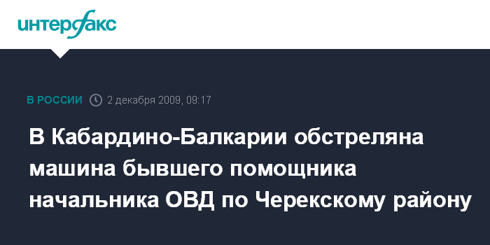 Москва. 2 декабря. INTERFAX.RU - В Кабардино-Балкарской республике у населенного пункта Псыгансу Урванского района неизвестные обстреляли машину бывшего сотрудника милиции.