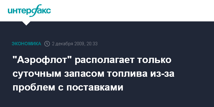 Москва. 2 декабря. INTERFAX.RU - ОАО "Аэрофлот - российские авиалинии", базирующееся в аэропорту "Шереметьево", по состоянию на вечер среды располагает запасом топлива, которого хватит лишь на сутки. Проблемы возникли из-за срыва поставок авиакеросина с Московского НПЗ, сообщили "Интерфаксу" несколько источников в авиационной и топливной отраслях.