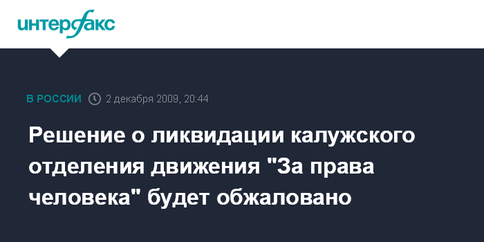 Москва. 2 декабря. INTERFAX.RU - Правозащитники рассчитывают обжаловать в суде решение о ликвидации регионального отделения общероссийского движения "За права человека" в Калуге.
