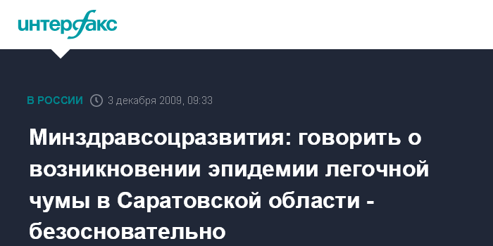 Москва.3 декабря. INTERFAX.RU - В Минздраве заявляют, что слухи о появлении в Саратовской области некоей легочной чумы безосновательны и даже преступны.