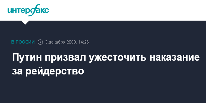 Москва. 3 декабря. INTERFAX.RU - Премьер-министр РФ Владимир Путин высказался за ужесточение наказания за рейдерство.