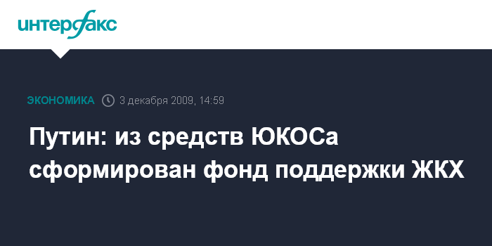 Москва. 3 декабря. INTERFAX.RU - Премьер-министр РФ Владимир Путин сообщил, что средства, которые были получены при продаже "ЮКОСа", были направлены на формирование фонда ЖКХ.