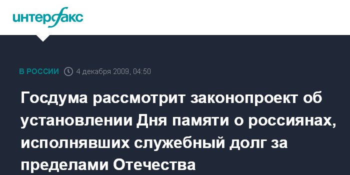 Москва. 4 декабря. ИНТЕРФАКС - Госдума в пятницу рассмотрит в первом чтении правительственный законопроект об установлении в РФ 15 февраля новой памятной даты - Дня памяти о россиянах, исполнявших служебный долг за пределами Отечества.