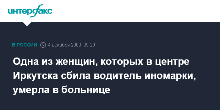 Москва. 4 декабря. INTERFAX.RU - В 3-й Кировской больнице Иркутска от полученных травм скончалась 34-летняя иркутянка, которую 2 декабря вместе с младшей сестрой на тротуаре сбила женщина-водитель, сообщили агентству "Интерфакс-Сибирь" в пресс-службе ГУВД по Иркутской области. "В связи с этим, после ряда необходимых юридических и медицинских процедур, следователи Главного следственного управления при ГУВД по Иркутской области намерены переквалифицировать деяние с ч. 2 на ч. 3 ст. 264 УК РФ (нарушение лицом, управляющим транспортным средством правил дорожного движения, повлекшее по неосторожности причинение тяжкого вреда здоровью человека, а так же смерть человека)", - отметили в ГУВД.