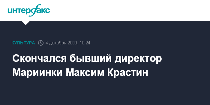 Москва. 4 декабря. INTERFAX.RU - В Петербурге на 82-м году жизни скончался бывший директор Мариинского театра Максим Крастин, сообщили "Интерфаксу" в пресс-службе театра в пятницу. "Это случилось 2 декабря. Завтра в Мариинском театре состоится прощание с Крастиным", - сказал собеседник агентства. Он добавил, что в субботу также пройдет отпевание усопшего в храме Смоленской иконы Божьей матери. Похоронен бывший директор Мариинки будет на Смоленском кладбище Петербурга.