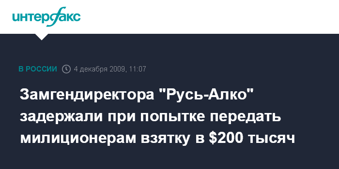 Москва. 4 декабря. INTERFAX.RU - Заместитель гендиректора ООО "Русь-Алко" задержан с поличным при передаче взятки на сумму $200 тыс. сотрудникам милиции за информацию о предстоящих следственных действиях по уголовному делу в отношении предприятия. В сообщении пресс-службы департамента экономической безопасности (ДЭБ) МВД РФ, поступившем в "Интерфакс" в пятницу, говорится, что Главное управление МВД РФ по ЦФО осуществляет расследование и оперативное сопровождение уголовного дела, возбужденного по факту производства ООО "Русь-Алко" алкогольной продукции с поддельными акцизными марками.