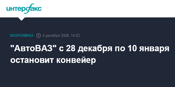 Самара. 4 декабря. INTERFAX.RU - ОАО "АвтоВАЗ" остановит конвейер с 28 декабря 2009 года по 10 января 2010 года, сообщили "Интерфаксу" в пресс-центре предприятия.