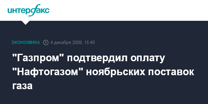Москва. 4 декабря. INTERFAX.RU -"Нафтогаз Украины" полностью оплатил ноябрьские поставки газа, сообщили журналистам в управлении информации "Газпрома". Как ранее сообщали представители украинской стороны, в ноябре "Нафтогаз" закупил 3,6 млрд кубометров газа на $770 миллионов.