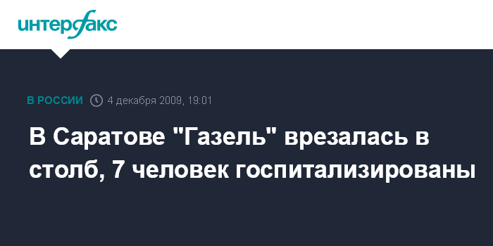 Саратов. 4 декабря. INTERFAX.RU - В Ленинском районе Саратова в пятницу вечером личная пассажирская "Газель" врезалась в опору линий электропередачи, в результате 7 человек с различными травмами госпитализированы.