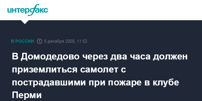 В Домодедово через два часа должен приземлиться самолет с пострадавшими при пожаре в клубе Перми