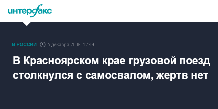 Красноярск. 5 декабря. INTERFAX.RU - В Красноярском крае в результате столкновения товарного поезда с самосвалом около двух часов было прервано железнодорожное движение на участке в Нижнеингашском районе, сообщили агентству "Интерфакс-Сибирь" в пресс-службе ГУ МЧС Красноярского края. "Поезд столкнулся с машиной в субботу 8 часов 10 минут по мск времени в Нижнеингашском районе. Жертв нет", - сказал собеседник агентсва. По его словам, движение поездов было перекрыто по обоим направлениям. "Сейчас движение восстановлено. На месте аварии работала оперативная группа пожарного гарнизона", - отметил пресс-секретарь.