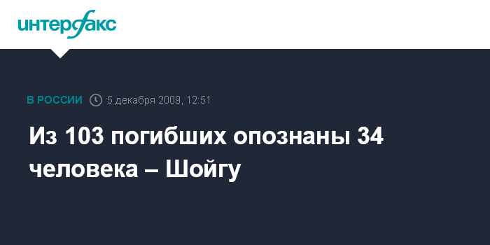 Горки. 5 декабря. INTERFAX.RU - К настоящему времени из 103 погибших при пожаре в ночном клубе в Перми опознаны 34 человека. Об этом глава МЧС РФ Сергей Шойгу доложил президенту России Дмитрию Медведеву в ходе совещания, которое глава государства провел в режиме видеоконференцсвязи в субботу.