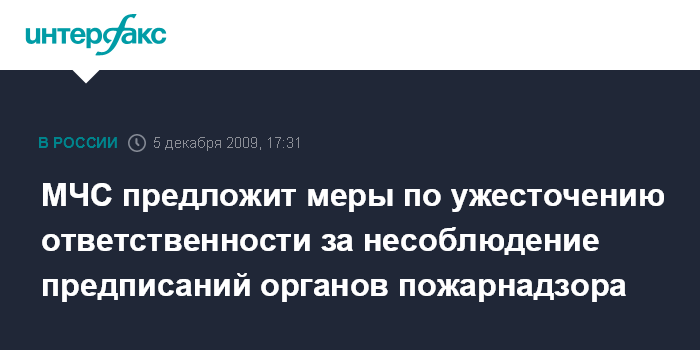 Москва. 5 декабря. INTERFAX.RU - МЧС РФ подготовит предложения по ужесточению ответственности, в том числе по увеличению штрафов, за несоблюдение предписаний органов пожарного надзора, заявил глава МЧС РФ Сергей Шойгу. "Будем готовить предложения по ужесточению и увеличению штрафов, по определению сроков временной приостановки деятельности объектов (в связи с нарушениями пожарных требований - ИФ)", - сказал С.Шойгу в интервью программе "Вести в субботу".