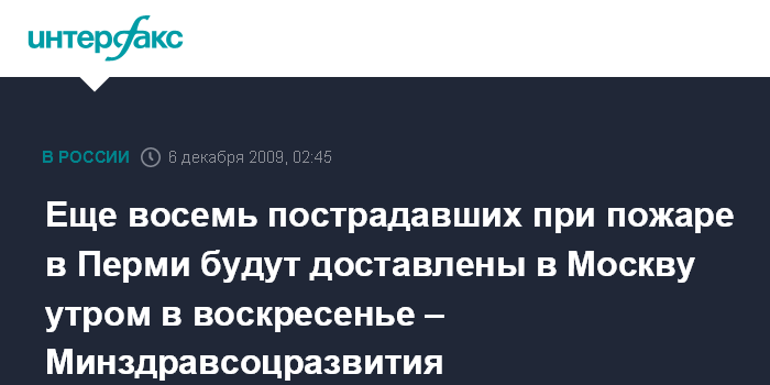 Еще восемь пострадавших при пожаре в Перми будут доставлены в Москву утром в воскресенье – Минздравсоцразвития
