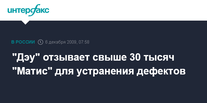Лондон. 6 декабря. INTERFAX.RU - GM Daewoo Auto & Technology - южнокорейская дочерняя компания "Дженерал моторс" - отзывает для устранения дефектов 30,7 тыс. микролитражек "Матис", выпущенных с июля по ноябрь 2009 года. Как сообщает британская вещательная корпорация Би-би-си, выяснилось, что стеклоочистители этих микролитражек не работают при низкой температуре, а надувные подушки безопасности при столкновении "отделяются от машины".