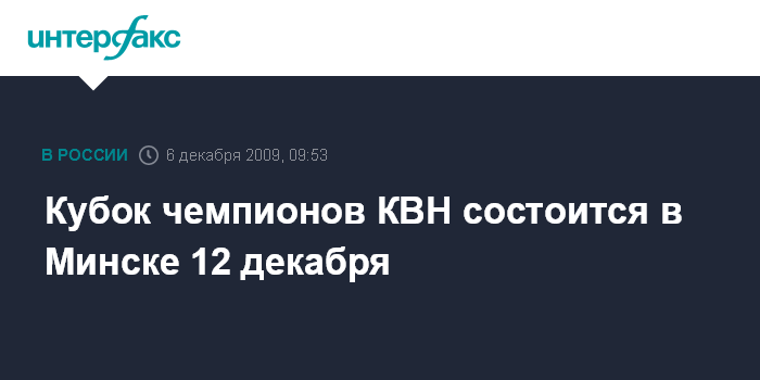 Минск. 6 декабря. INTERFAX.RU - 12 декабря в минском Дворце Республики состоится Кубок чемпионов Международного союза КВН, сообщил обозревателю портала www.interfax.by директор ООО "ТТО "АМИК" в Белоруссии Сергей Сербун. "Это будет большой вечер КВН, в котором примут участие чемпионы центральных и межрегиональных лиг Клуба веселых и находчивых со всех регионов России. Ожидается, что участие в Кубке чемпионов примут участие от 10 до 20 команд", - рассказал С.Сербун.