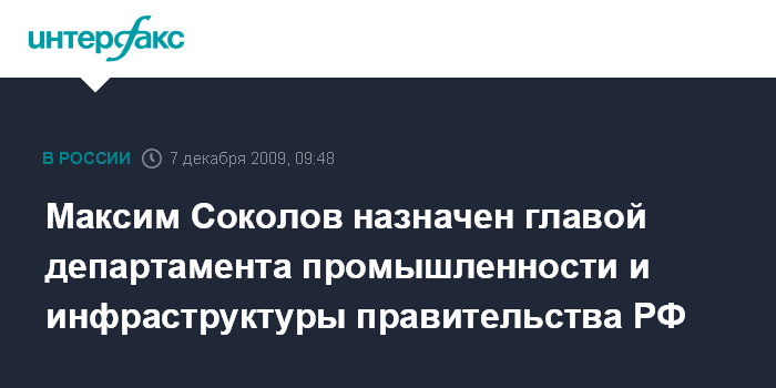 Москва. 7 декабря. INTERFAX.RU - Главой департамента промышленности и инфраструктуры правительства РФ назначен Максим Соколов, сообщили "Интерфаксу" в пресс-службе правительства. Соколов сменил на этом посту Александра Мишарина, который 23 ноября был утвержден в должности губернатора Свердловской области.