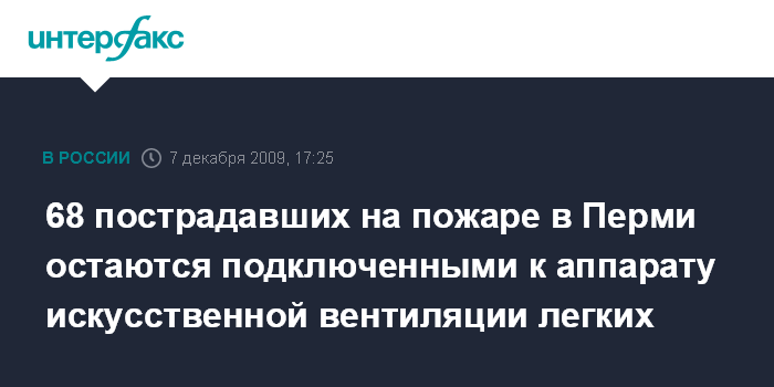 Москва. 7 декабря. INTERFAX.RU - Из более 100 человек, пострадавших от пожара в Перми, и помещенных в больницы Москвы, Санкт-Петербурга и Челябинска, 68 остаются подключенными к аппарату искусственной вентиляции легких , заявила министр здравоохранения и социального развития Татьяна Голикова.