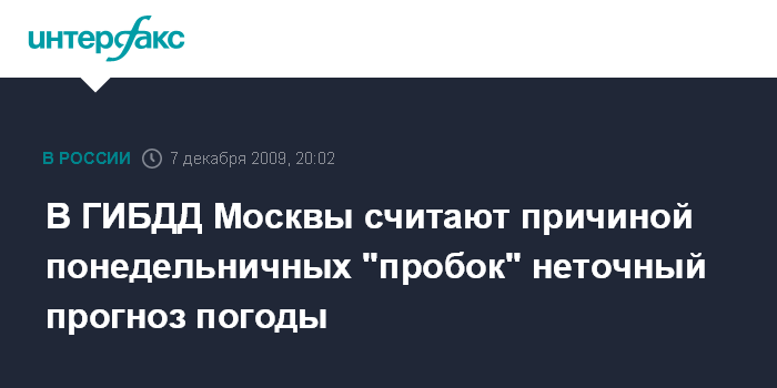 Москва. 7 декабря. INTERFAX.RU - Причиной многокилометровых пробок в Москве является несвоевременный и неточный прогноз погоды, заявил "Интерфаксу" заместитель начальника управления ГИБДД ГУВД города Москвы полковник милиции Игорь Исаев.