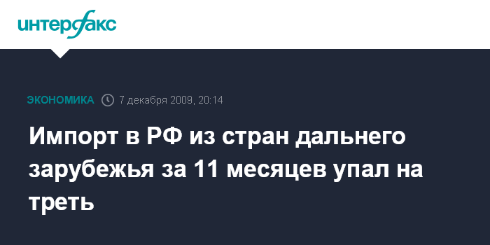 Москва. 7 декабря. INTERFAX.RU - Импорт в РФ из стран дальнего зарубежья за январь-ноябрь 2009 г. составил $140,83 млрд, что на 33,4% меньше, чем за аналогичный период 2008 года. Соответствующие предварительные данные распространила в понедельник Федеральная таможенная служба (ФТС).